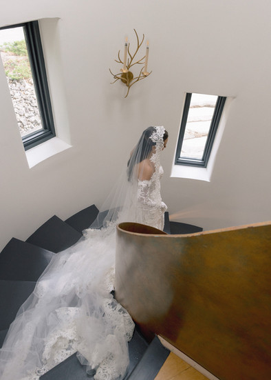 This wedding at Elora Mill unfolded like a timeless Italian romance film set against the sculptural beauty of modern architecture. The couple’s day carried an intentional contrast; soft lace and delicate florals meeting the raw textures of stone and metal. Simone got ready at Cedarcliff Elora, a historic home down the road from the venue. It’s winding staircases and curved bronze details became a natural frame for capturing quiet, cinematic moments; Simone descending in her lace gown and cathedral-length veil felt almost like a painting in motion.